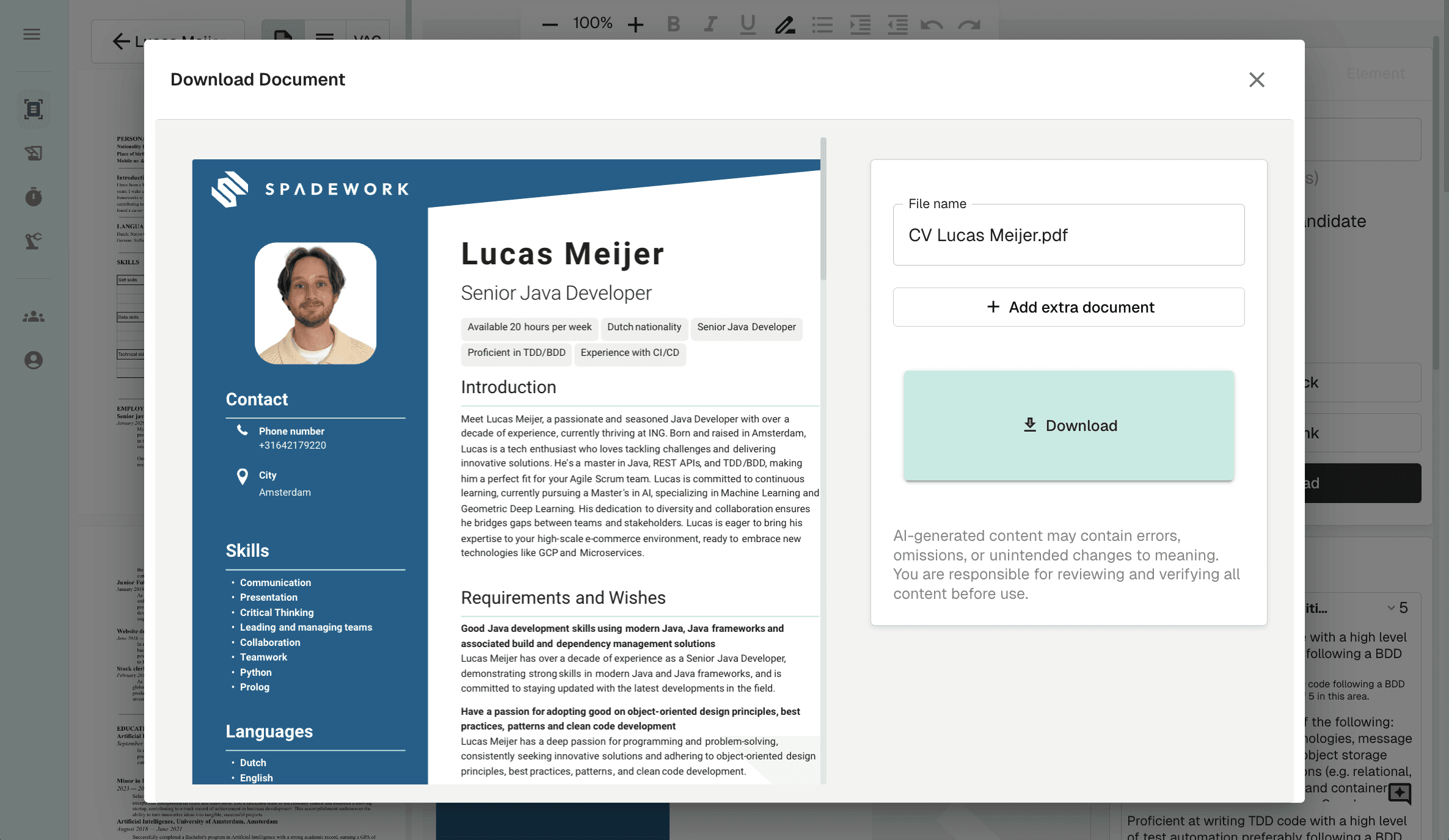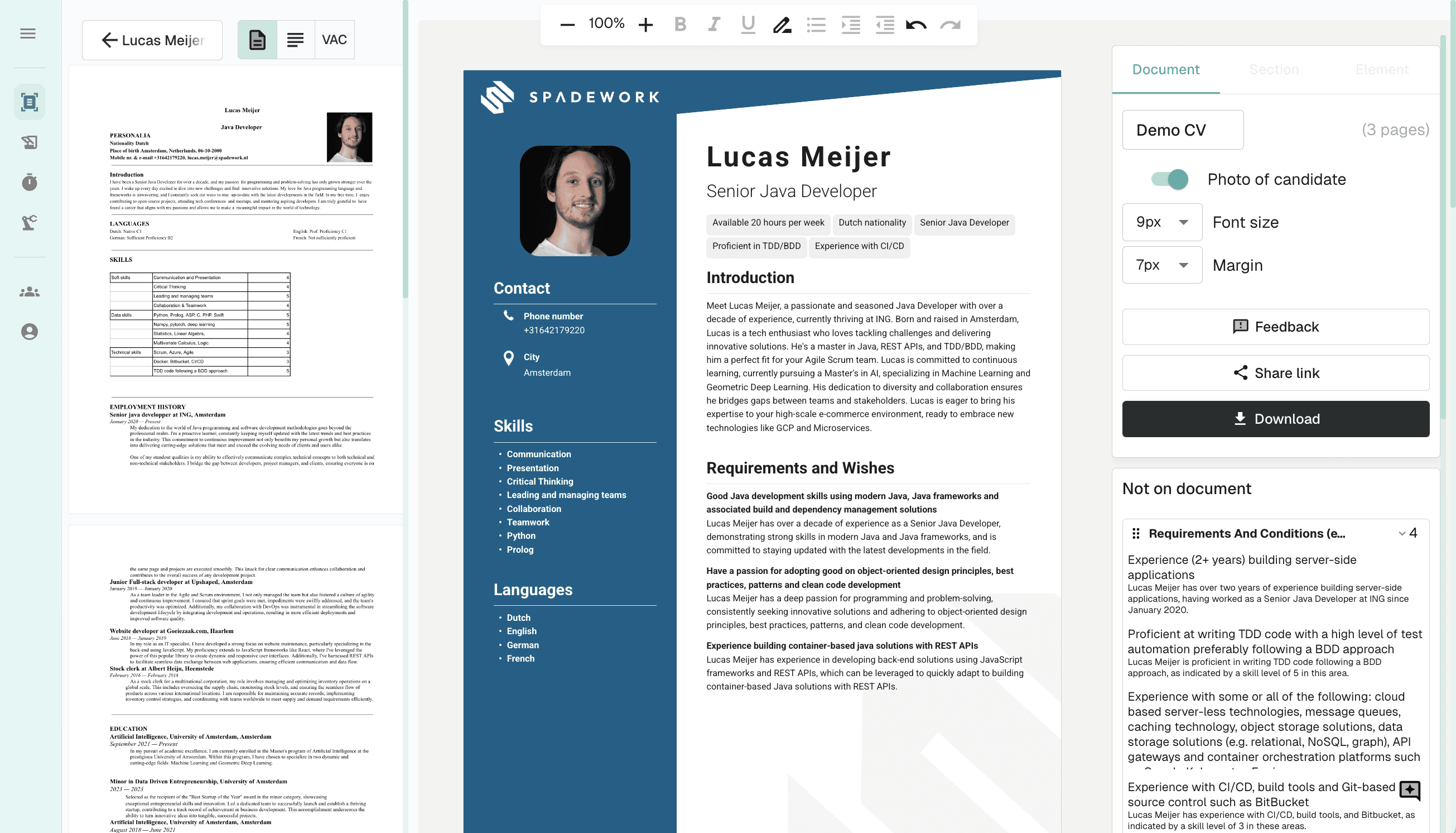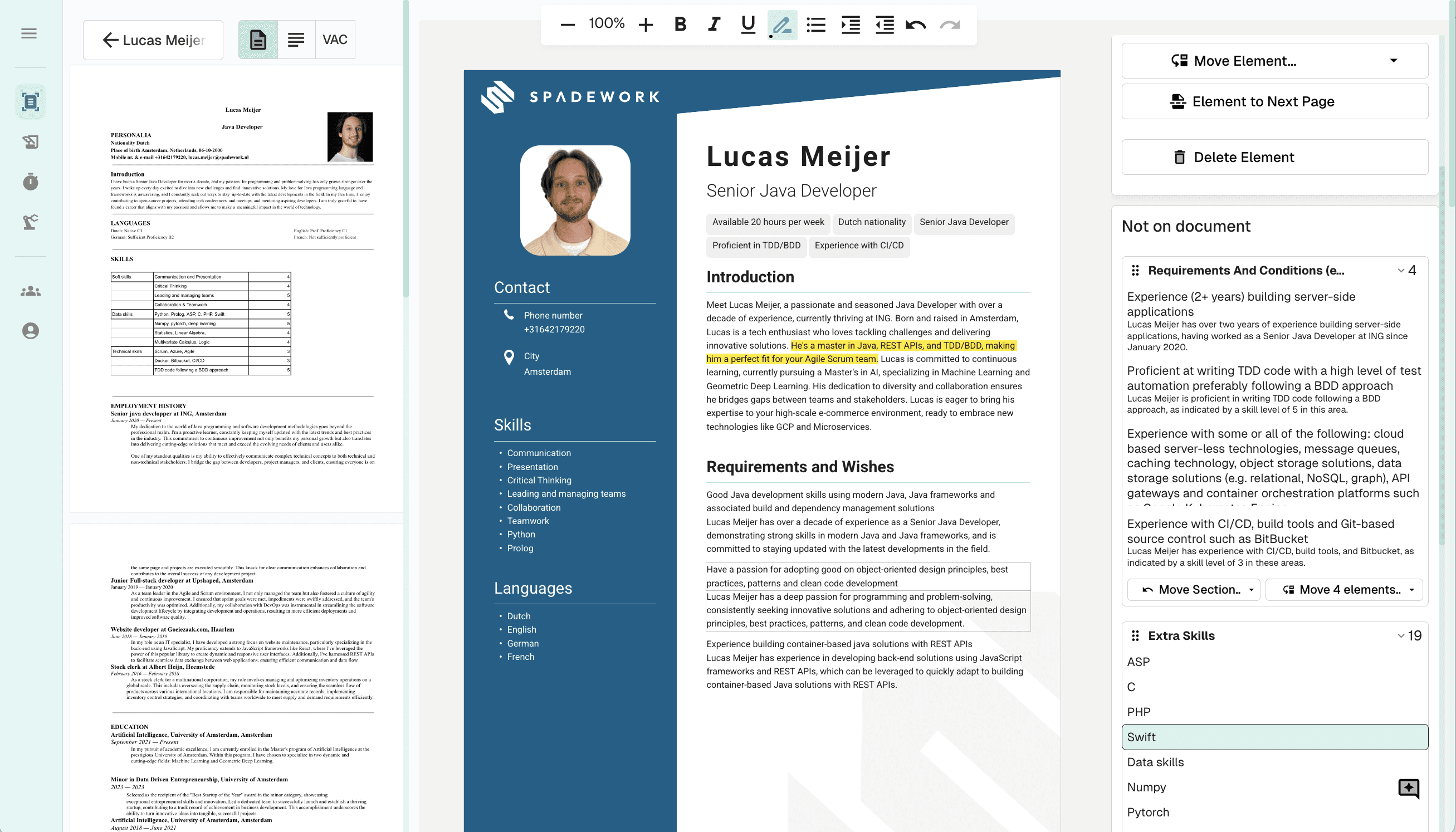 Je kunt alles direct op het CV aanpassen. Onze editor is speciaal gebouwd voor recruiters en werkt super simpel. Of je nu de tekst herschrijft of elementen verplaatst: jij houdt de controle, eventueel met hulp van onze AI-assistent.