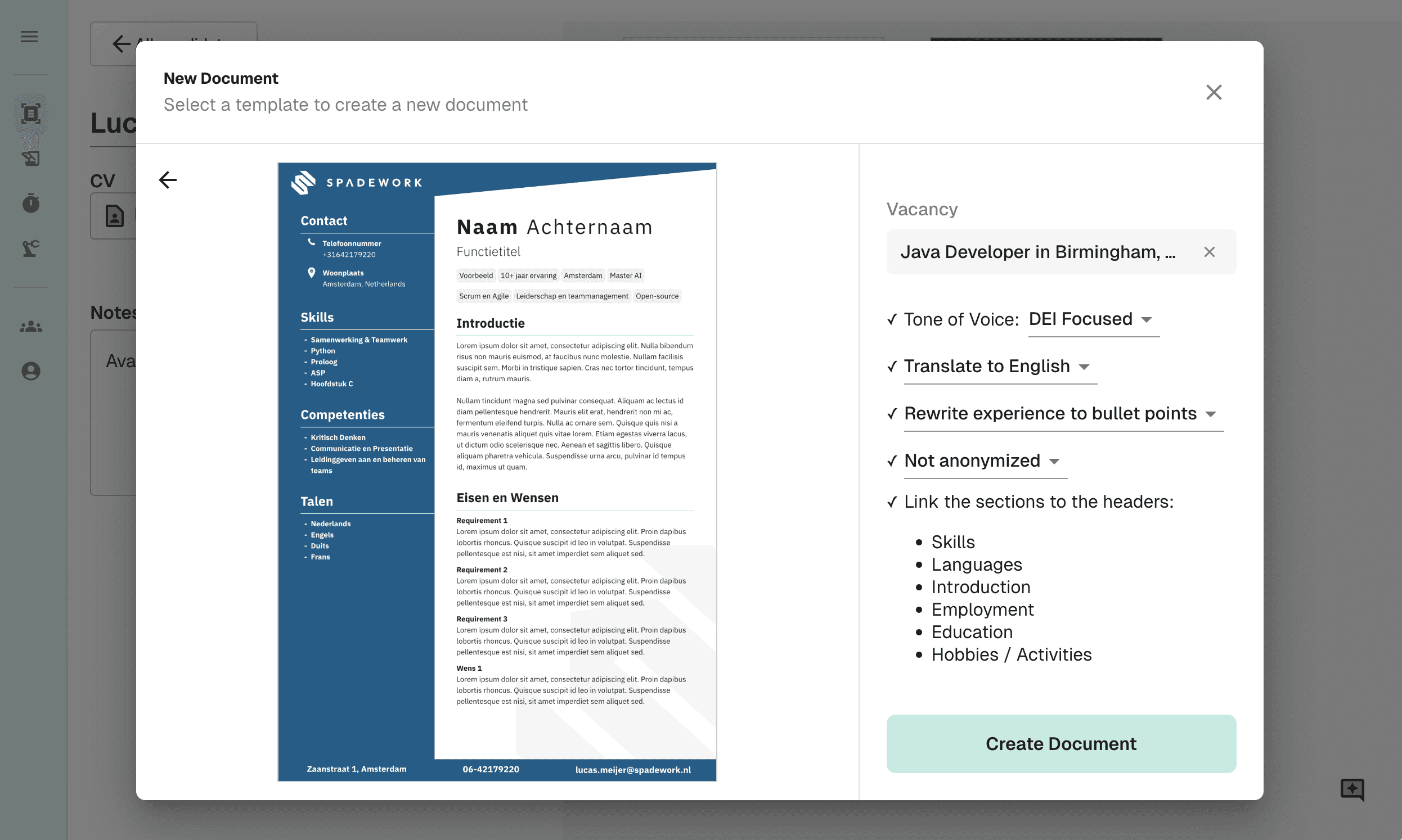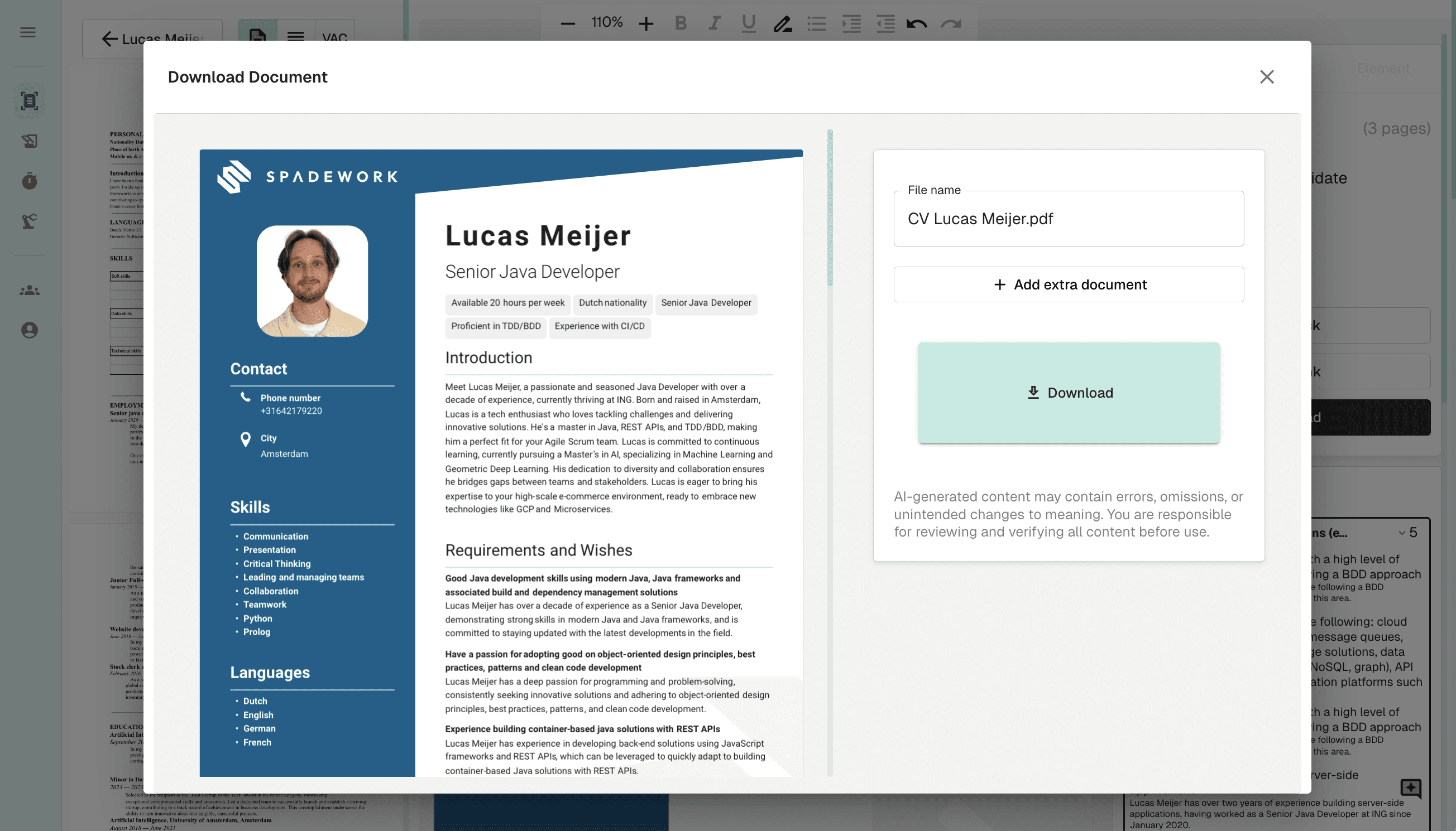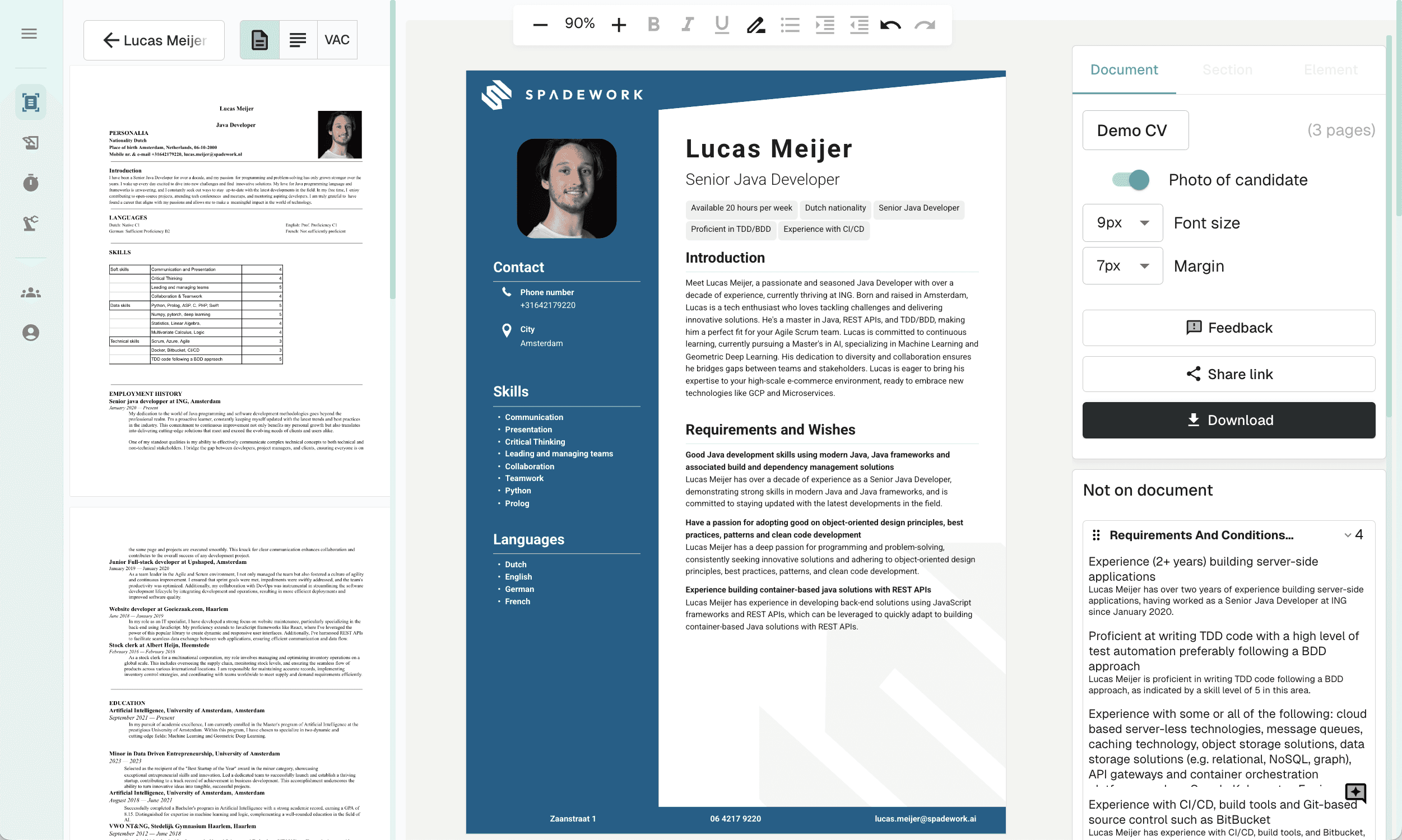 Je kunt alles direct op het CV aanpassen. Onze editor is speciaal gebouwd voor recruiters en werkt super simpel. Of je nu de tekst herschrijft of elementen verplaatst: jij houdt de controle, eventueel met hulp van onze AI-assistent.
